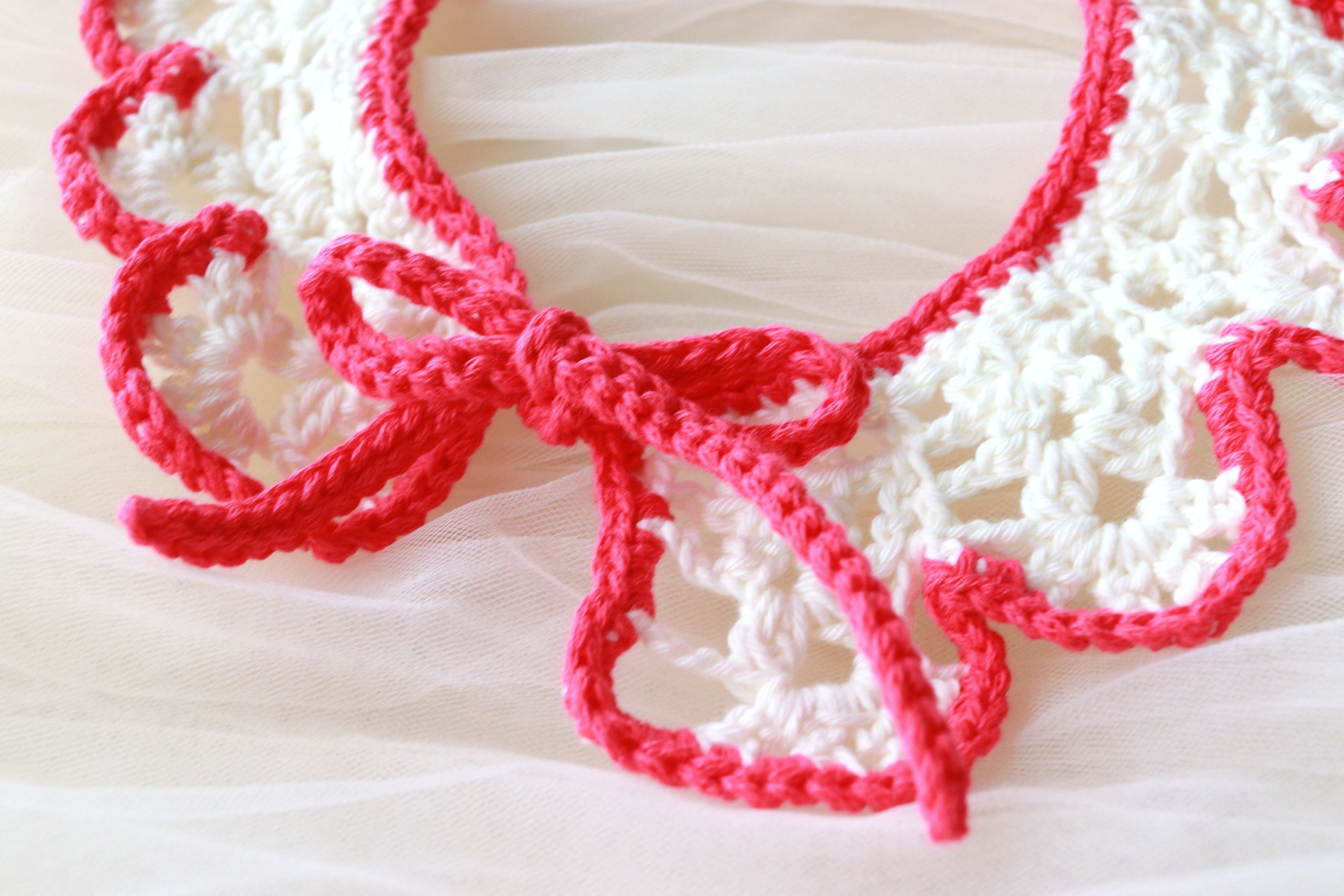 お洋服を選ばず、ワンピースやカットソーに合わせるだけでグッと可愛くなるレース編みのつけ襟です。